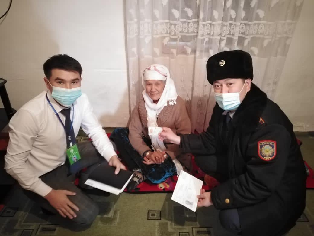 Полицейлер 92 жастағы Сұлу Аликулова мен 78 жастағы Әбділдә Айбала аналарымыздың үйіне барды. Олардың жеке куәлік алулары үшін, полицейлер фотосуретке түсіріп, құжаттарын рәсімдеп, қажетті шараларды атқарды. Осылайша куәліктер қысқа мерзімде әзірленіп қарияларға табысталды.